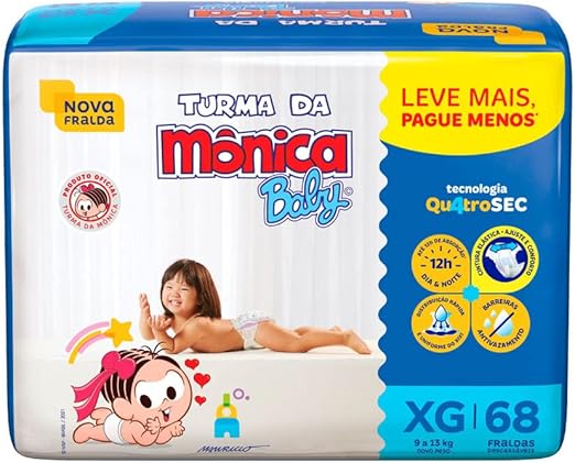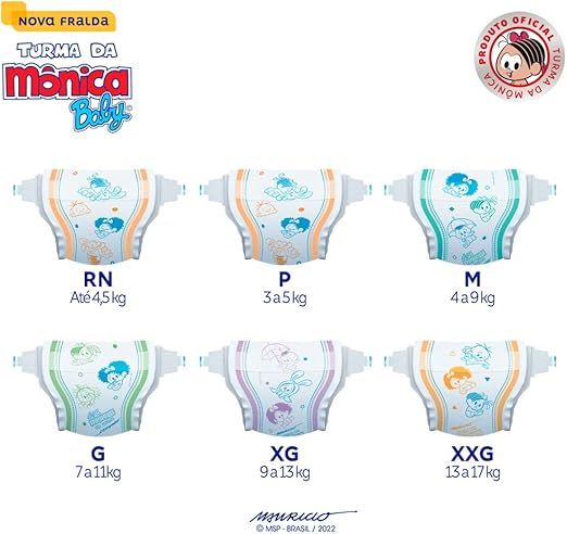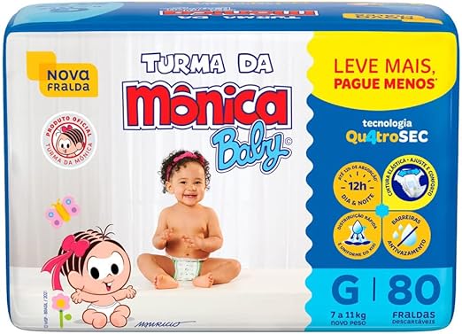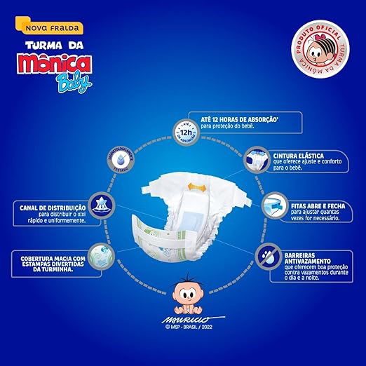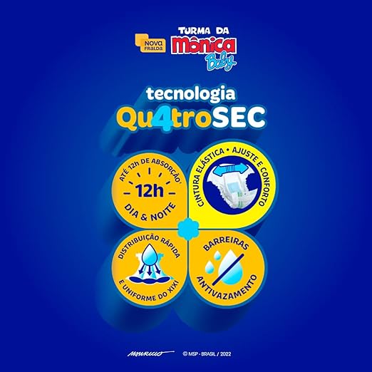 A Turma da Mônica Baby uniu proteção e conforto em uma nova opção de fralda, para garantir que seu bebê cresça feliz e tenha as melhores lembranças da sua infância. A Nova fralda Turma da Mônica Baby possui a nova Tecnologia QuatroSec para que ele fique calmo, tranquilo e seguro durante o dia e a noite toda. Conta com um exclusivo sistema de canais que distribui mais rápido o xixi, barreiras anti-vazamento e uma fina camada extra que ajuda a manter o bebê sequinho por até 12 horas, além de cintura elástica que proporciona um perfeito ajuste no corpinho.